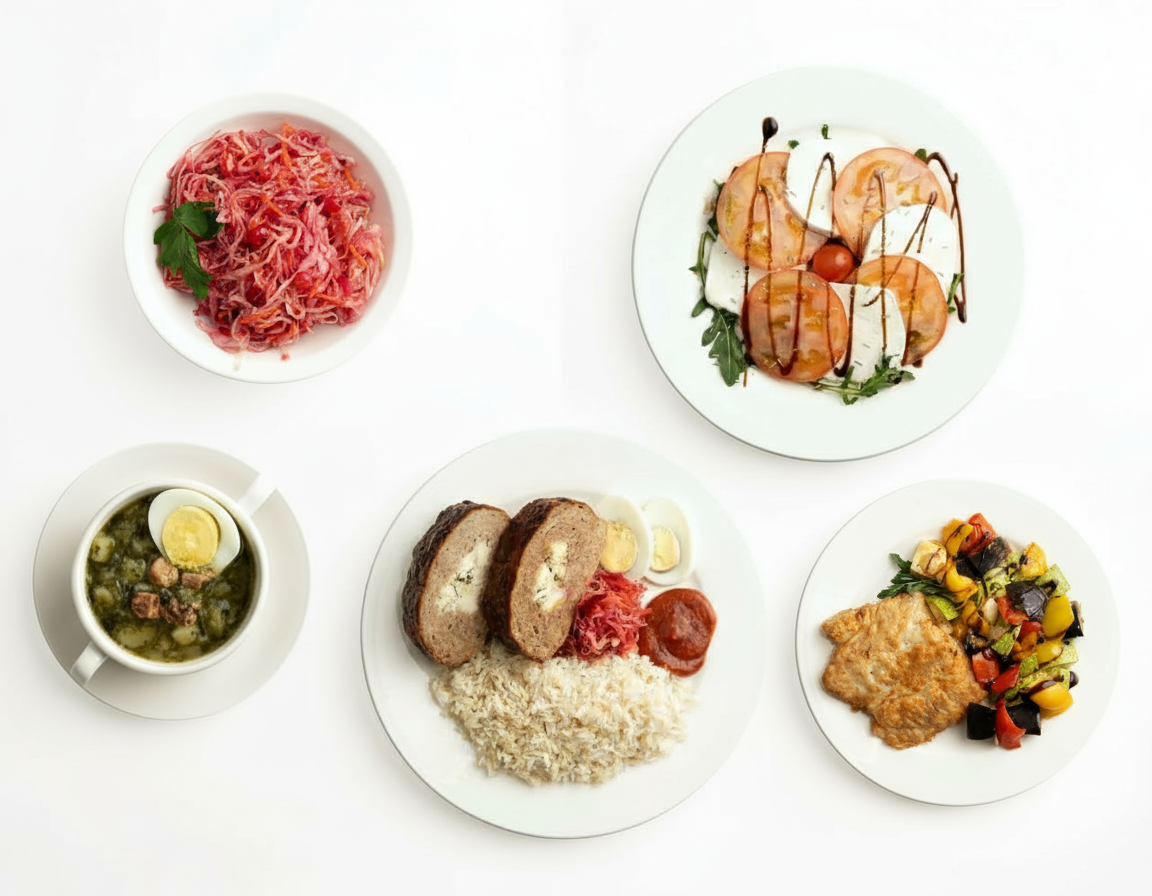 Состав: суп, 2 салата, 2 горячих с гарниром, 2 напитка