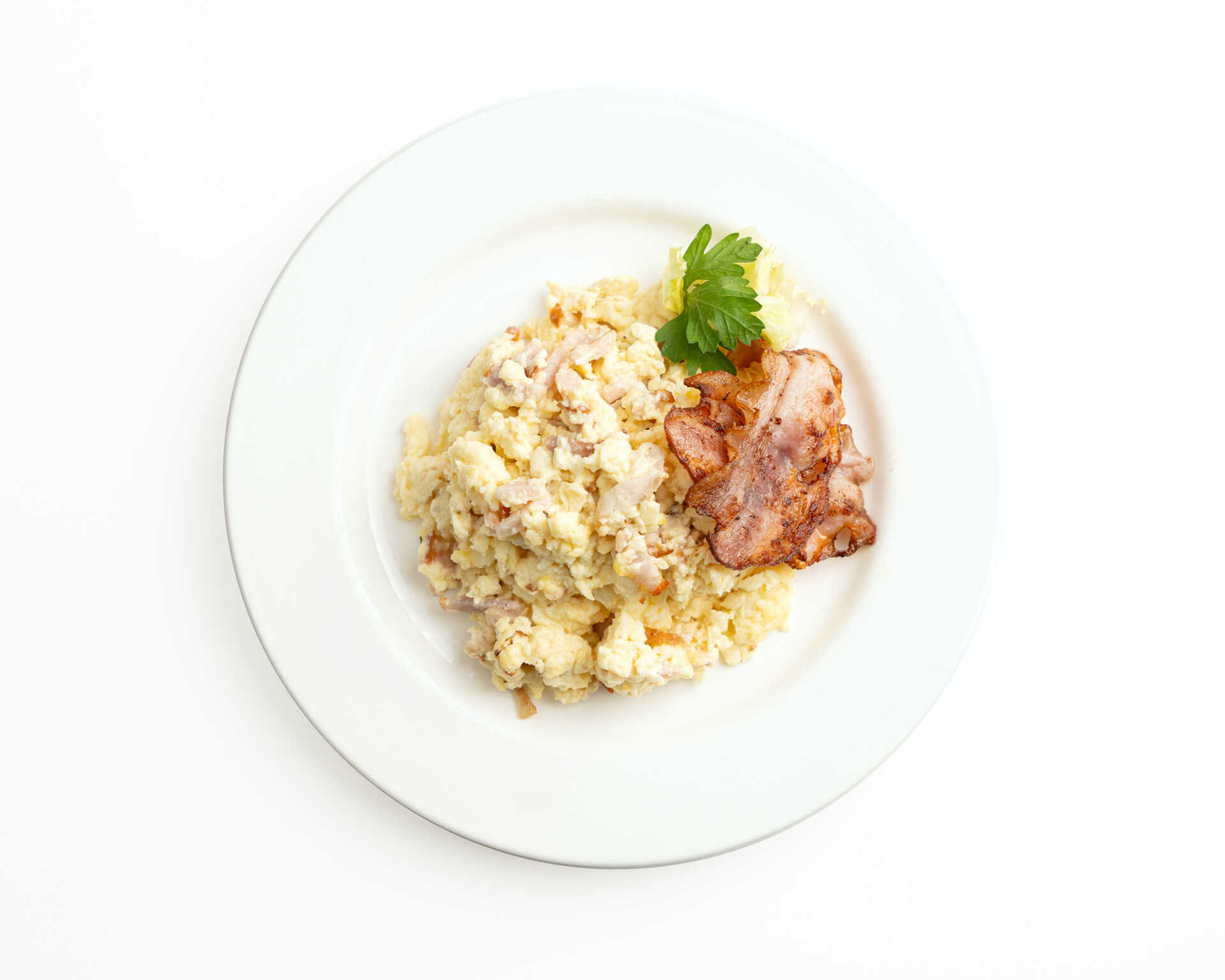 Скрэмбл с беконом – идеальное сочетание нежного взбитого яйца и ароматных кусочков копченостей. Быстрое и вкусное начало дня! Высокое содержание белка обеспечивает длительное чувство сытости, а натуральные ингредиенты гарантируют пользу и безопасность блюда. Удобно упаковано для вашего комфорта и экономии времени. Приятного аппетита!