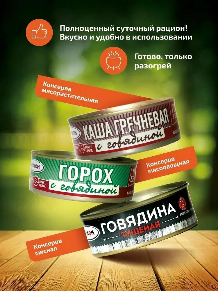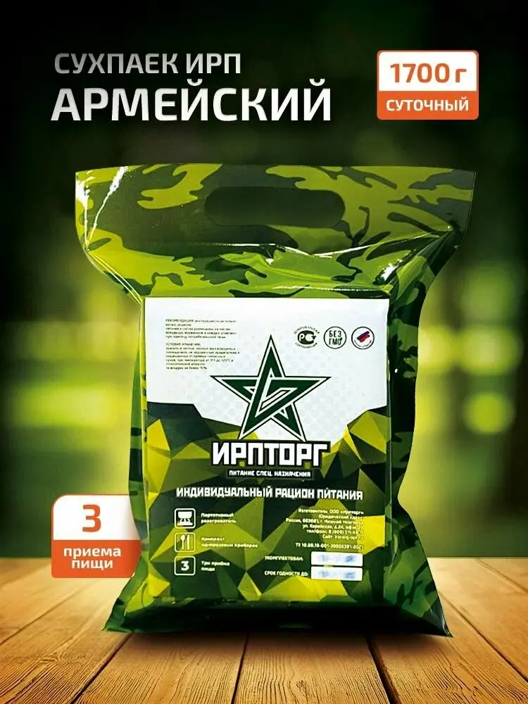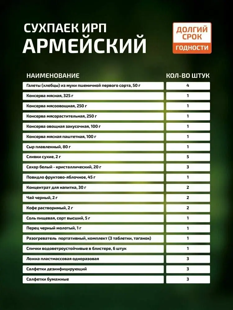 Состав: Галеты армейские из муки пшеничной 200 гр. Консервы мясные не менее 250 гр. Консервы мясоовощные 250 гр. Консервы мясорастительные 250 гр. Паштет 100 гр. Консервы овощные закусочные 100 гр. Сыр плавленный стерилизованный 80 гр. Сливки сухие 10 гр. Сахар 60 гр. Повидло фруктовое 45 гр. Концентрат напитка тонизирующий 60 гр. Чай черный байховый 4 гр. Кофе натуральный растворимый 4 гр. Соль поваренная пищевая 5 гр. Перец черный молотый 1 гр. Разогреватель портативный, комплект (3 табл +таганок) Спички водоветроустойчивые, 6 шт. Ложка пластмассовая одноразовая 3 шт. Салфетки дезинфицирующие 3 шт. Салфетки бумажные 3 шт.